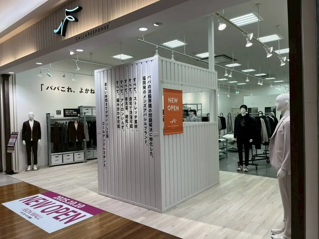 CALL&RESPONSE株式会社(本社:福岡市博多区、代表取締役:長江正勝)が運営する、「パパこれ、よかね。」をキャッチコピーに掲げる、パパの洋服界隈の課題解決に特化した福岡発のメンズブランド「CALL & RESPONSE(コールアンドレスポンス)」は、10月10日、福岡県北九州市のイオンモール八幡東の3階に「CALL & RESPONSE イオンモール八幡東店」をオープンしました。